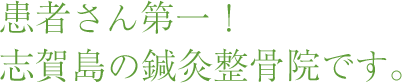 「痛みがとれた!」という患者様たちの笑顔が私たちの喜びです。 たとえベテランスタッフであっても、患者様たちのために常に技術の向上に努めています。 アットホームな雰囲気で、志賀島の漁師、農家の方、また一人暮らしのご老人の方にもご利用いただいております。